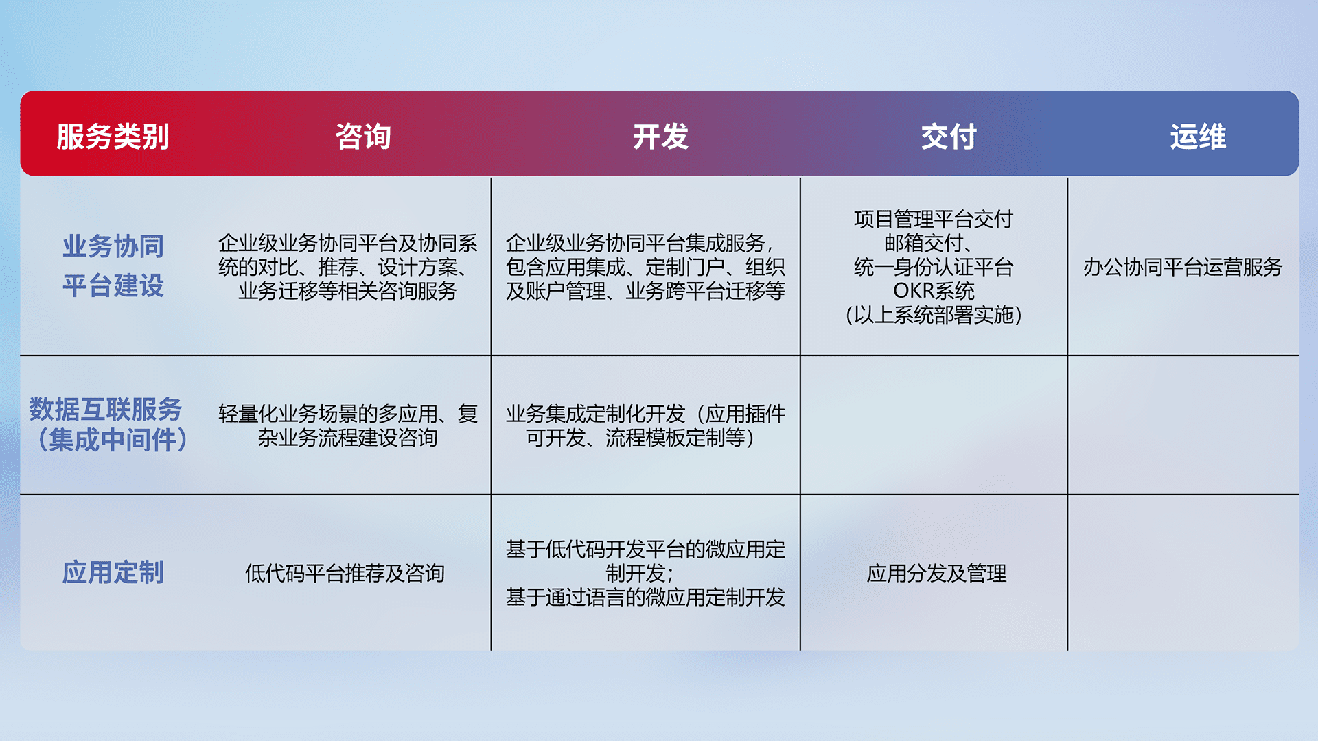 针对钉钉、、企微、、、IDaas等平台级产品提供产品的规划、、方案、、、交付、、、定制化开发等服务,,,实现如统一协同办公、、、智能客户服务、、、混合会议管理、、智能数据查询、、等业务场景,,,实现数字化转型。。。。
